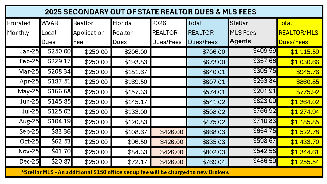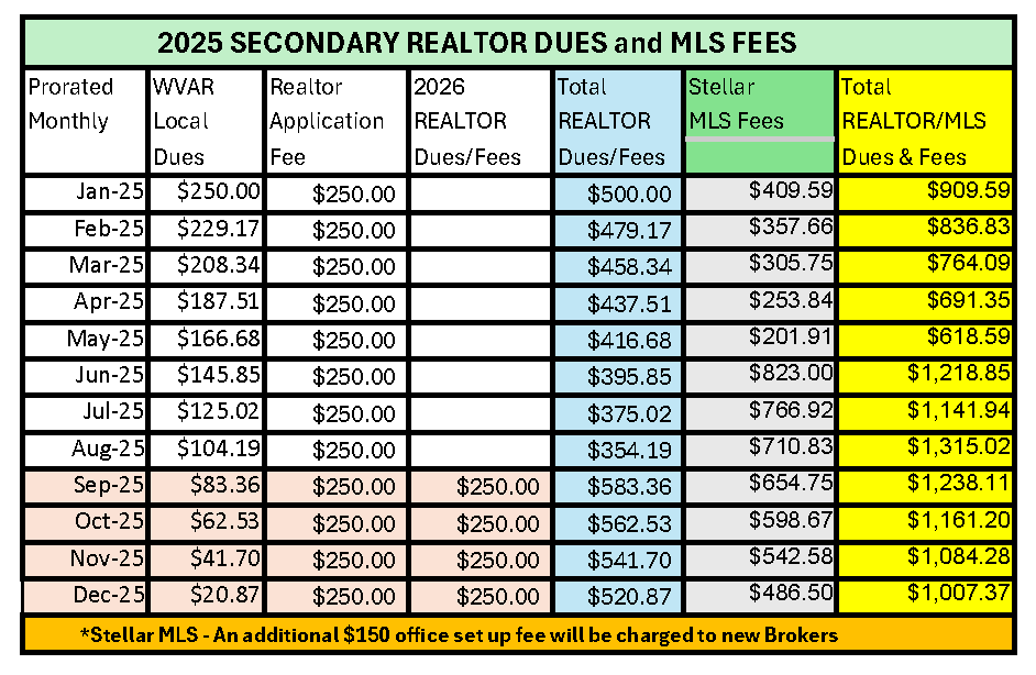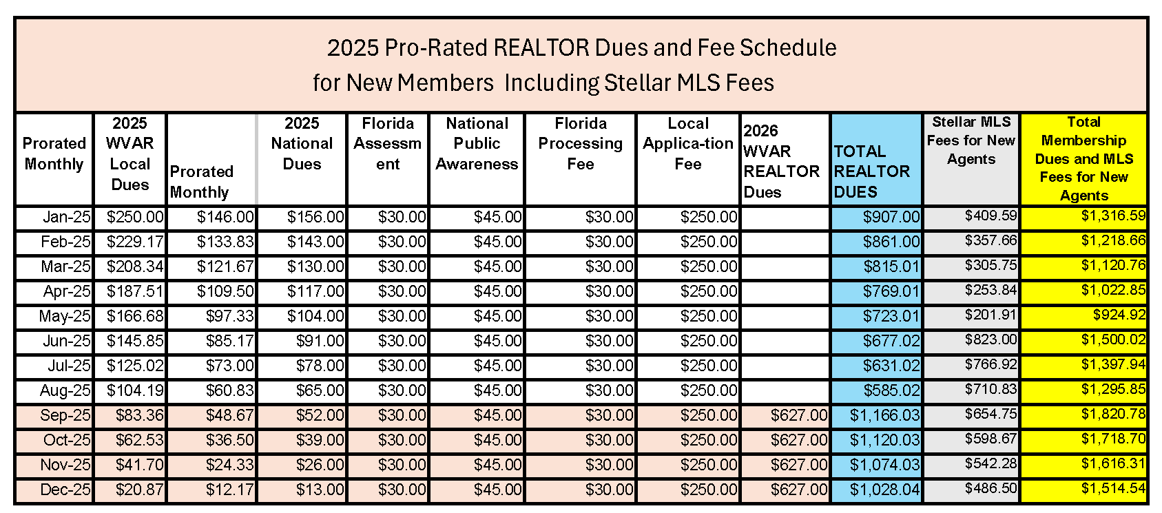 Pay the dues and fees related to membership. This will include an application fee, dues to the local, state and national associations of REALTORS®; and also fees to Stellar MLS. An outline of those fees by month have been listed below.